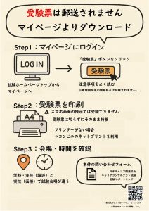受験票はWEB上での発行となっております。 受験票は郵送されませんので、以下の内容をご確認のうえ、各自でご対応をお願いいたします。